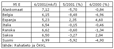 Keskeisissä euromaissa bensiinin hinta on laskenut kesäkuussa 2001