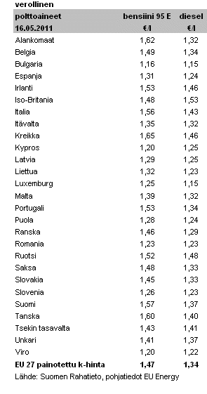 2011. Suomessa diesel maksoi keskimäärin 1,37 €/l.