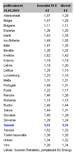 Polttoaineiden keskihinnat 31.1.2011 Eu-maissa.