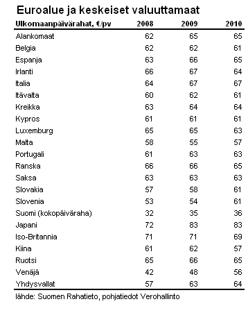 Taulukossa on esitetty ulkomaan päivärahan kehitys 2008 - 2010 euroalueella ja keskeisissä valuuttamaissa.