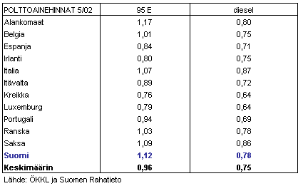 Euroalueella bensiinin hinta oli toukokussa 2002 keskimäärin 96 senttiä. Vastaavasti dieselin hinta oli euroalueella keskimäärin 75 senttiä. Suomessa bensiinin keskimääräinen kuluttajahinta oli toukokuussa 2002 selvästi korkeampi eli 1,12 euroa. Diesel maksoi Suomessa toukokuussa keskimäärin 78 senttiä.