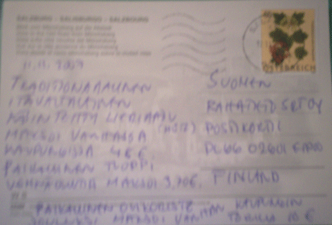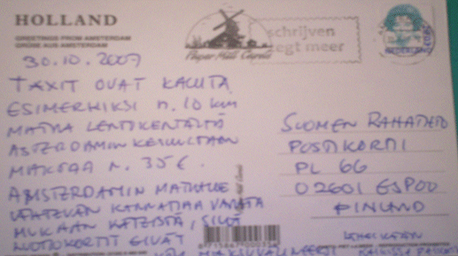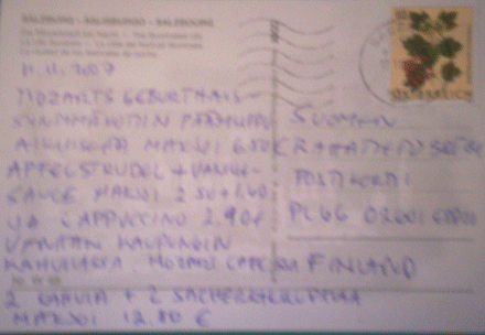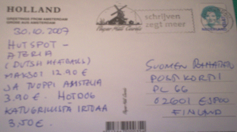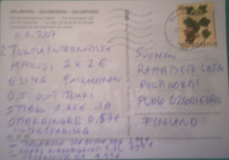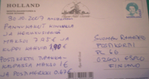 Pannukakut kinkulla ja herkkusienillä maksoi 7,95 € ja kuppi maitokahvia 1,90 €. Postikortti tupakkakaupassa