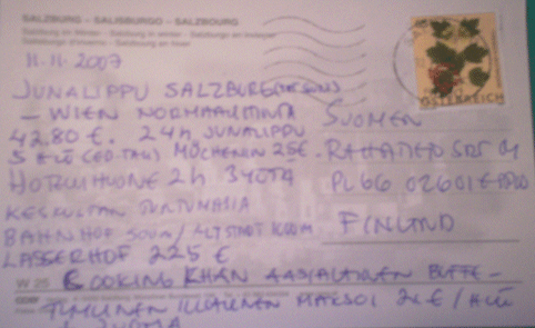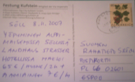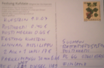 Postikortti 0,40 €, postimerkki 0,65 €. Festung Kufstein linnan hissilippu maksoi (2 aik + 1 lapsi) 17 €.