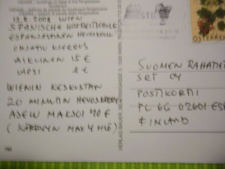 Spanische Hofreitschule espanjalaisen ratsastuskoulun ohjattu kierros: aikuinen 15 € ja lapsi 8 €. Wienin keskustassa 20 minuutin hevoskärryajelu maksoi 40 € (max. 4 henkilöä). (12.8.2008) Museums Quartier:n kahvilassa maksoi Cafe Latte 3,30 € ja juustokakkupala 3,50 €. Panimoravintolassa Fischerbrau - gasthof - brauerei maksoi oluttuoppi (lager) 3,30 € ja vehnäoluttuoppi 3,50 €. Kasnocken - juustoknokit 7,30 € ja Surstelze - porsaan luullinen lihapala kahdelle 16,90 € ja lisuke: salaatti 2,80 €. (12.8.2008)