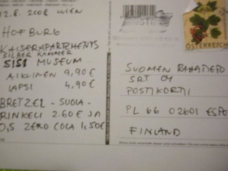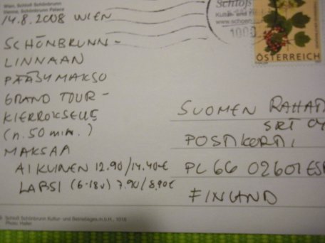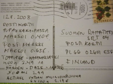 Postikortti tupakkakaupasta maksoi 0,40 €. Postimerkki maksoi 0,65 €. Kaupasta Toffifee - karamelliaski 400 g maksoi 3,49 €, Häagen - Dazs - jäätelö 500 ml 2,99 € ja vatsavaivoja ehkäisevä Actimel 6 x 100 g 2,19 €. (12.8.2008)