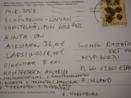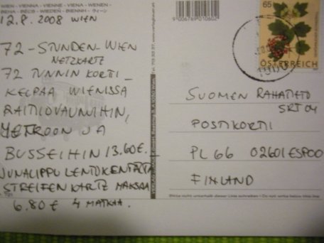 72 - Stunden Wien Netzkarte: 72 -tunnin matkakortti kelpaa Wienissä linja-autossa, metrossa ja raitiovaunussa 13,60 €.Junaliput lentokentältä maksaa 6,80 € (4 matkaa). (12.8.2008) Hofburg Kaiserapartements Silber Kammer: SISI Museum pääsymaksut: aikuinen 9,90 € ja lapsi 4,90 €. Rathaus - Parkin kojusta Bretzen - suolarinkeli maksoi 2,60 € ja 0,5 l Zero Cola 1,50 €.(12.8.2008)