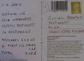 Postcards 6 x 0,50 £ = 3,00 £, 6 first cls stamps 1,69 £, total 4,68 £.