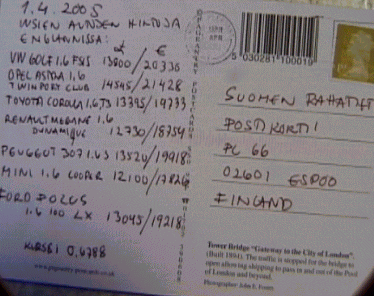 10 postikorttia ja postimaksut Suomeen olivat yhteensä 7.90 euroa.