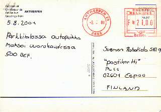 Parkkitalossa autopaikka maksoi vuorokaudessa 500 bef. (5.8.2001)
